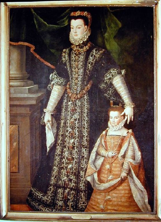 | Description : Portrait en pied d'une femme et de sa fille, les deux personnages habillées à la mode de la Cour d'Espagne des années 1560. Les modèles portent le vertugadin cloche à l'espagnole, très peu usité en France mais porté par la reine d'Espagne, d'origine française, Elisabeth de Valois dans ses portraits des années 1560, en particulier dans son portrait peint par Sofonisba Anguissola en 1565 pour l'entrevue de Bayonne (Madrid, musée du Prado). Diane d'Andoins dite "Corisande" (d'après le roman espagnol de chevalerie l'Amadis de Gaule porte le vertugadin cloche à l’espagnole, costume de la cour d’Espagne dit saya avec ceinture de pierres précieuses. L’enfant porte le même habit mais avec les manches ouvertes. Il faut noter les bagues portées au pouce et à l’index. Ce portrait traduit le grand prestige de la mode aristocratique espagnole auprès de la noblesse européenne. Le style espagnol est promu par une Française, Elisabeth de Valois (1545-1568), troisième épouse de Philippe II roi d’Espagne. Lorsque la reine vint à Bayonne en 1565 pour rencontrer son frère Charles IX, sa mère Catherine de Médicis s’écria : « Ma fille, vous êtes bien Espagnole ! » En l’espace d’une décade, la mode espagnole acquiert une valeur universelle et capte l’attention des femmes. Les portraits de la reine sont peints par des artistes de divers horizons : l’Espagnol Pantoja de la Cruz, le Flamand Anthonis Mor devenu Antonio Moro, l’Italienne Sofonisba Anguissola nommée dame d’honneur de la reine (Sofonisba accompagne la reine à Bayonne). Les tableaux sont envoyés en cadeaux diplomatiques dans toute l’Europe et popularisent le nouveau luxe espagnol exprimé sur un fond d’austérité au niveau des couleurs. Le vêtement noir ou sombre met en valeur l’éclat des bijoux répartis avec abondance sur tout le costume. L’attitude réservée du modèle et le mouvement figé des bras, contribuent à créer une image de solennité et de distance souveraine. Les portraits sont recopiés de nombreuses fois y compris après la mort de la reine, car elle a inauguré la mode féminine de la seconde moitié du XVIe siècle, avec une silhouette délimitée par des formes géométriques rigides qui occultent le corps mais laissent libre le visage et les mains où se concentre l’expression. En 1566 et 1567, Elisabeth donne naissance à ses deux filles qu’elle laisse orphelines l’année suivante. Celles-ci sont représentées enfants portant le même style de costume que leur mère. La mère et la fillette portent en conséquence le vertugadin cloche à l'espagnole. Il s'agit d'une « saya » à broderies de perles et de fils d'or, avec collier et ceinture de pierres précieuses. Le portrait en pied, cadré à gauche par une colonne sur piédestal et draperie, la robe noire entièrement brodée de perles, l’étroite fraise en dentelles, le diadème, le collier et la ceinture de pierres précieuses rappellent le grand portrait en pied de la reine d'Espagne peint vers 1565 par Sofonisba Anguissola (musée du Prado) et le diadème est d’une forme assez proche de celui du portrait en buste de la reine toujours par Anguissola conservé à Milan (Pinacoteca di Brera). Seule différence, les manches galonnées d’or de la chemise de la reine sont libérées de la saya qui ne se rattache que par un point à la base du bras et apparait comme un manteau. La fillette Catherine de Gramont porte un costume presque semblable à celui de sa mère dans la découpe mais d’une couleur très claire dans le jaune orangé, avec une saya ouverte sur les manches formant une sorte de manteau ou cape tenue par un point à l’avant-bras imitant curieusement le costume d’Elisabeth de Valois. En l'état actuel de la recherche, la seule mention sous l'Ancien Régime, d'un portrait de Diane d'Andoins se trouve en 1678 dans l'inventaire après décès du maréchal-duc Antoine III de Gramont au château de Hagetmau (lieu de naissance de « Corisande », grand-mère d'Antoine III). Il y est inscrit dans la chambre du maréchal-duc : « sur la cheminée de ladite chambre le tableau de Corisandre [sic] d'Andoins », sans que l'on sache si le modèle est accompagné d'un enfant. Plus tard, les inventaires de mobilier du château de Bidache, de 1720 à 1741, mentionnent la présence, dans la chambre du duc de Gramont, au-dessus de la cheminée, d'un tableau d'une « femme habillée à l'espagnole avec une fille à son côté » sans autre précision qui ne peut que s’appliquer à notre portrait. En 1812, le portrait est inventorié à Compiègne chez la veuve du duc Antoine VII de façon approximative : « Un tableau représentant Corisande Desandoin et son fils femme [sic] du ci-devant vicomte d’Astée ». |