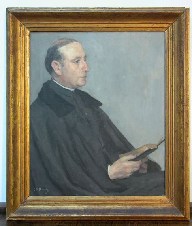 | Description : Portrait de profil et à mi-corps du chanoine Jean Lamarque en soutane et manteau, tenant des deux mains un livre ouvert (bréviaire) |