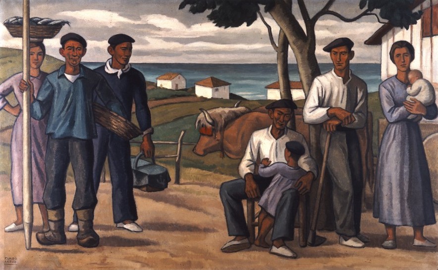 Ce tableau est une illustration du Pays Basque selon Ramiro Arrue (Abando, 1892 – Saint-Jean-de-Luz, 1971). L’artiste biscayen, formé à Paris, sacralise le quotidien des Basques en puisant son inspiration chez Puvis de Chavannes, Paul Gauguin et Maurice Denis. Il exalte le juste repos et les fruits du travail, la famille réunie, signe de pérennité humaine, et le paysage immobile à peine effleuré par la saine activité des hommes. Il met en valeur la simplicité et la rusticité des mœurs, transformant ses figures en solides symboles qui vivent en harmonie avec une nature bienfaisante et intemporelle.